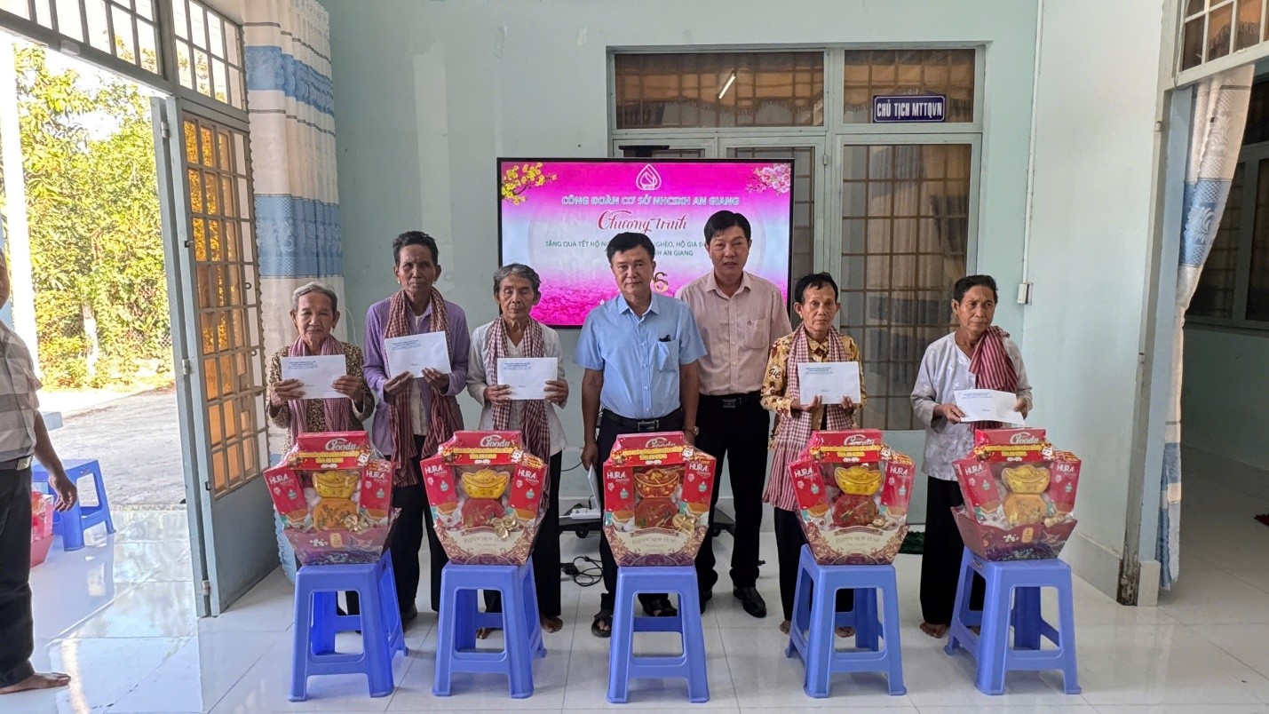 Theo đó có 20 phần quà mỗi phần trị giá 700 nghìn đồng gồm bánh mức và tiền mặt 500 nghìn đồng. Tổng kinh phí 14 triệu đồng. Tại buổi trao quà, đại diện NHCSXH đã ân cần thăm hỏi đời sống, tình hình sản xuất của bà con, đồng thời gửi lời chúc mừng năm mới an khang, đầm ấm. Những phần quà tuy giá trị không lớn nhưng thể hiện sự quan tâm, chia sẻ kịp thời, góp phần giúp các hộ Khmer vui xuân, đón Tết thêm đủ đầy. Bên cạnh các gói tín dụng chính sách hỗ trợ người dận, hoạt động trao quà Tết, cũng được Ngân hàng chính sách xã hội tỉnh An Giang duy trì thườnfg xuyên, thể hiện tinh thần trách nhiệm xã hội, đồng hành cùng cấp ủy, chính quyền địa phương trong công tác chăm lo đời sống cho người dân, đặc biệt là bà con  vùng đồng bào  dân tộc và miền núi