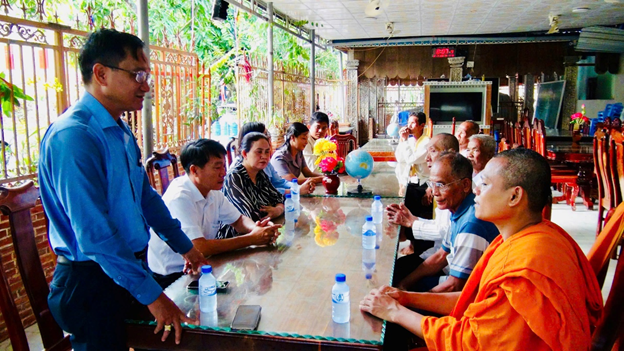 Tại mỗi chùa, Phó bí thư Đảng ủy, Chủ tịch UBND xã Ô Lâm thông tin nhanh về kết quả công tác sắp xếp tổ chức bộ máy chính quyền 02 cấp đi vào hoạt động từ ngày 1/7/2025 đến nay. Trong đó xã Ô Lâm mới thành lập trên cơ sở sáp nhập từ 03 xã anh hùng lực lượng vũ trang nhân dân của huyện Tri Tôn cũ. Với trên 65% dân số là đồng bào Khmer, hơn 1.000 hộ nghèo, cận nghèo, do đó bên cạnh củng cố, nâng cao chất lượng hiệu năng, hiệu quả, hoạt động của bộ máy chính trị. Đảng bộ, chính quyền xã Ô Lâm luôn quan tâm chăm lo an sinh xã hội, hỗ trợ đời sống vật chất tinh thần cho người dân, nhất là vùng đồng bào dân tộc. Nhân dịp lễ Sen Đônta năm nay, xã đã vận động chương trình mái ấm ATV trao kinh phí xây nhà cho 10 hộ khmer khó khăn, chuẩn bị tổ chức khám bệnh cấp phát thuốc miễn phí cho 700 bà con khmer, trao tặng 18 bộ máy vi tính cho 18 ấp phục vụ công tác tiếp nhận hồ sơ thủ tục hành chính. Thời gian tới cấp ủy, chính quyền xã tiếp tục triển khai các đề án chương trình giảm nghèo, chương trình mục tiêu quốc gia phát triển kinh tế xã hội vùng đồng bào dân tộc thiểu số và miền núi, giúp người dân có sinh kế thoát nghèo bền vững. Mong muốn các vị sư sãi, ta à cha, người có uy tín luôn đồng hành cùng chính quyền địa phương trong tuyên truyền, vận động bà con phật tử chí thú làm ăn, phát huy hiệu quả các mô hình được hỗ trợ để vươn lên. Đồng thời tích cực tham gia các phong trào, các cuộc vận động, góp phần giữ cuộc sống bình yên, xây dựng phum sóc ngày càng văn minh.