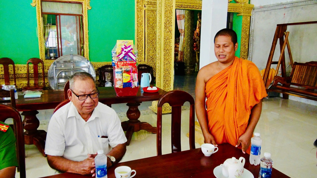 Phó bí thư Đảng ủy, Chủ tịch UBND xã Ô Lâm Phan Thanh Lương tặng quà chùa Kom Phlưng và người có uy tín ấp Phước An