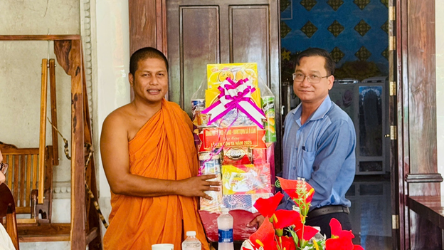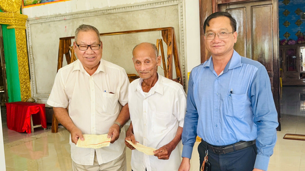 Phó bí thư Đảng ủy, Chủ tịch UBND xã Ô Lâm Phan Thanh Lương tặng quà chùa Kom Phlưng và người có uy tín, gia đình chính sách ấp Phước Lợi