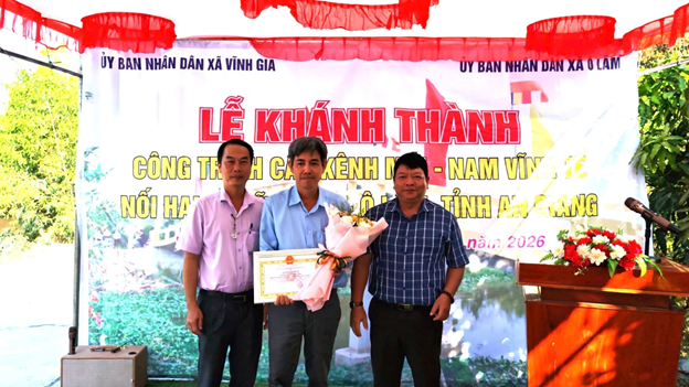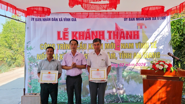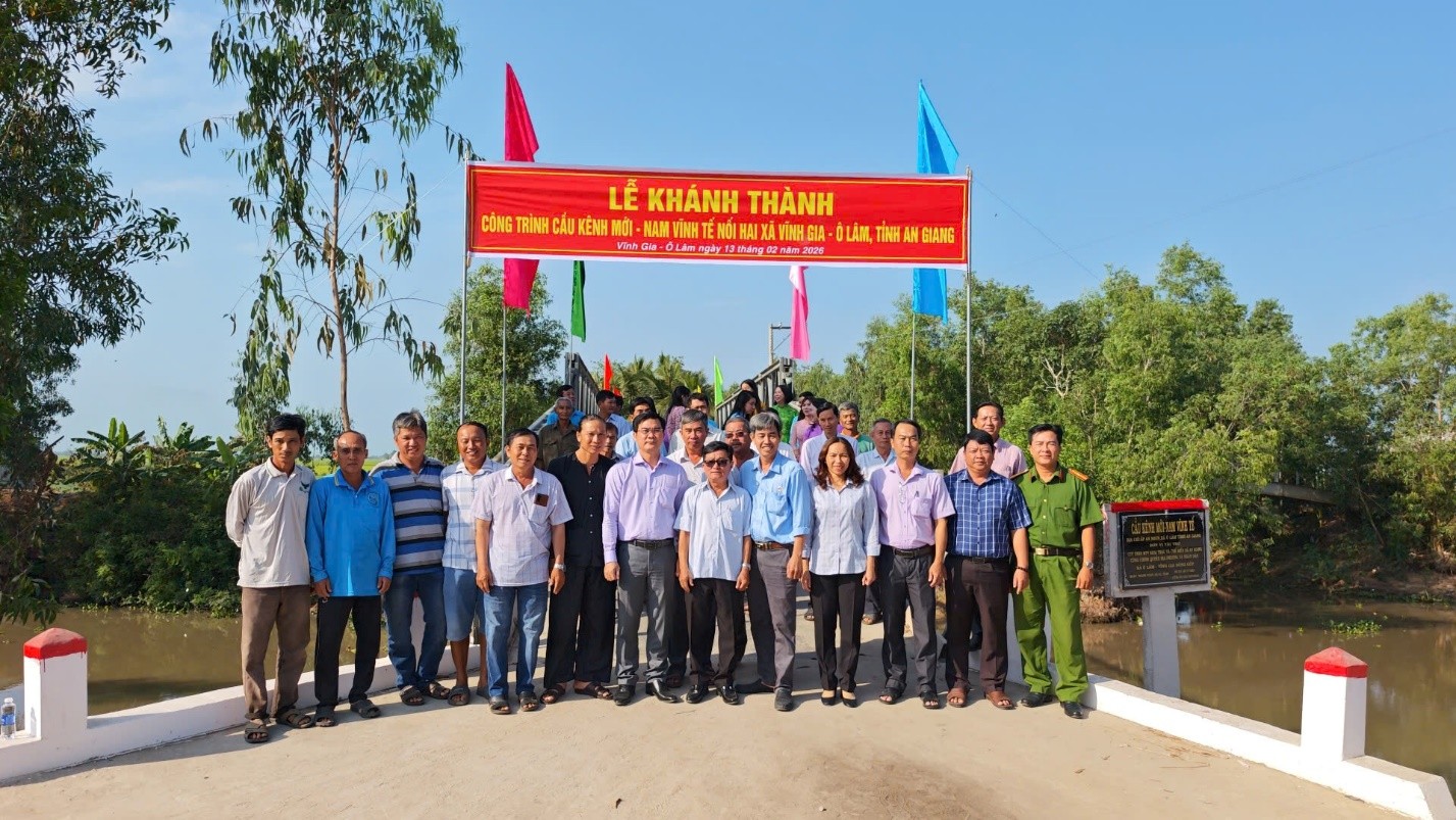 Trong không khí rộn ràng của những ngày giáp tết Bính Ngọ, sáng ngày 13/2/2026, Đảng ủy, HĐND, UBND và Ủy ban Mặt trận tổ quốc Việt Nam 2 xã Vĩnh Gia và Ô Lâm, tỉnh An Giang, tổ chức lễ khánh thành cầu Kênh mới - Nam Vĩnh Tế. Đến dự có đồng chí Trần Thị Thanh Tuyền - Phó bí thư thường trực xã Vĩnh Gia; đồng chí Tiêu Đình Hiếu Nhân Trung - Phó bí thư thường trực xã Ô Lâm; đồng chí Nguyễn Minh Đẳng - Phó Chủ tịch UBND xã Vĩnh Gia; đồng chí - Đặng Quốc Tuấn - Phó Chủ tịch UBND xã Ô Lâm.