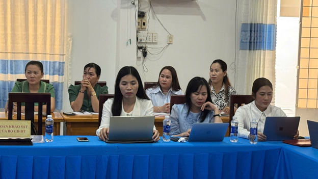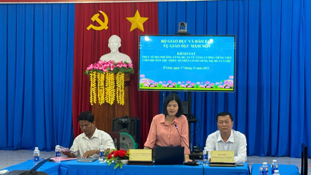 Đoàn tiến hành trao đổi trực tiếp và phát phiếu khảo sát cán bộ quản lý, giáo viên các trường Mẫu giáo về đặc điểm ngôn ngữ, địa lý, văn hóa, phương ngữ. Tỷ lệ trẻ em dân tộc Khmer trong từng lớp. Năng lực tiếng Việt của trẻ: Mức độ nghe – hiểu, vốn từ, khả năng phát âm, độ mạnh dạn khi giao tiếp với giáo viên và bạn bè. Việc xây dựng kế hoạch tăng cường tiếng Việt; phương pháp dạy học lồng ghép trong các hoạt động; khả năng sử dụng tiếng Khmer để hỗ trợ chuyển tiếp cho trẻ khi cần thiết. Tình trạng góc tiếng Việt, góc thư viện thân thiện; hệ thống bảng chữ cái, học liệu song ngữ Việt – Khmer; không gian trải nghiệm trò chơi, kể chuyện, âm nhạc, vận động. Sự phối hợp giữa nhà trường, gia đình và xã hội đối với việc dạy tăng cường tiếng Việt cho học sinh Khmer bậc mẫu giáo.