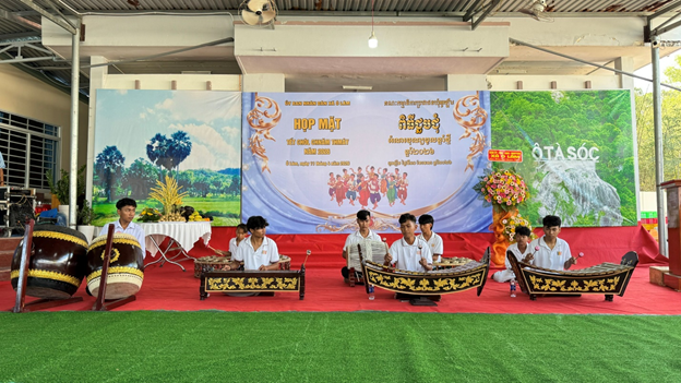 Tại buổi họp mặt, các đại biểu được thưởng thức một số tiết mục văn nghệ và biểu diễn dàn nhạc ngũ âm của đồng bào Khmer. Nghe thư chúc mừng tết Chôl Chnăm Thmây năm 2026 của Tỉnh ủy, HĐND, UBND, Ủy ban MTTQ Việt Nam và Chỉ huy các lực lượng vũ trang nhân dân tỉnh An Giang gửi đến toàn cán bộ, chiến sĩ, công chức, viên chức, các vị chức sắc tôn giáo, người có uy tín tiêu biểu, gia đình chính sách là người dân tộc Khmer