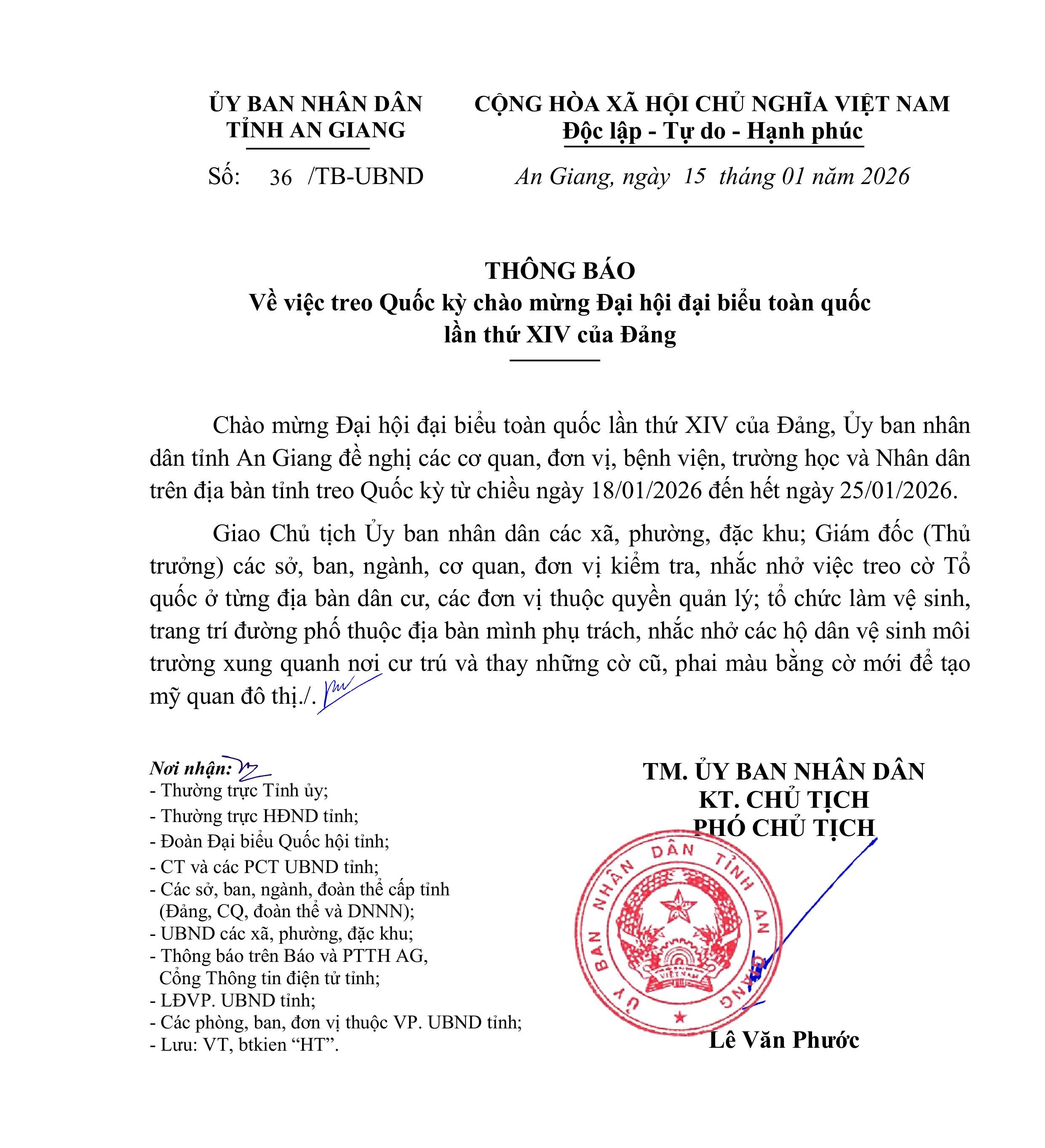 Tất cả các cơ quan, đơn vị, Trạm y tế, các Trường học và các hộ dân trên địa bàn xã treo Quốc kỳ từ 06 giờ sáng thứ Hai, ngày 16/02/2026 Dương lịch (tức ngày 29 tháng Chạp năm Ất Tỵ) đến hết thứ Sáu, ngày 20/02/2026 Dương lịch (tức ngày mùng 4 tháng Giêng năm Bính Ngọ).