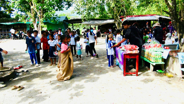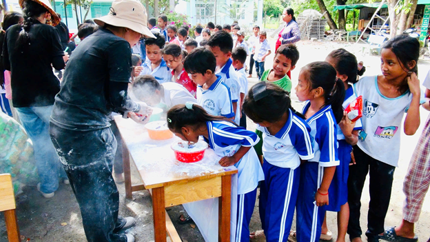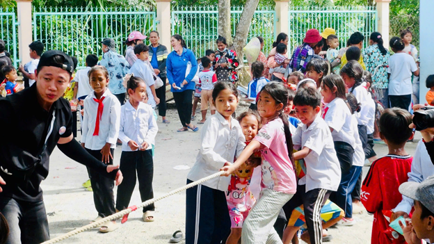 Tại chương trình các em được tham gi nhiều gian hàng trò chơi có thưởng như kéo co, tìm báu vật, nhảy bao bố, đá bóng vào khung thành, tô màu. Giao lưu và tập múa với nhật vật hoạt hình thỏa, gấu và các bạn tình nguyện viên, biểu diễn võ thuật và các tiết mục văn nghệ mang âm hưởng dân ca khmer. Ngoài ra mội học sinh khi tham gia các trò chơ sẽ được phátt một suất ăn nhẹ và phần nước uống