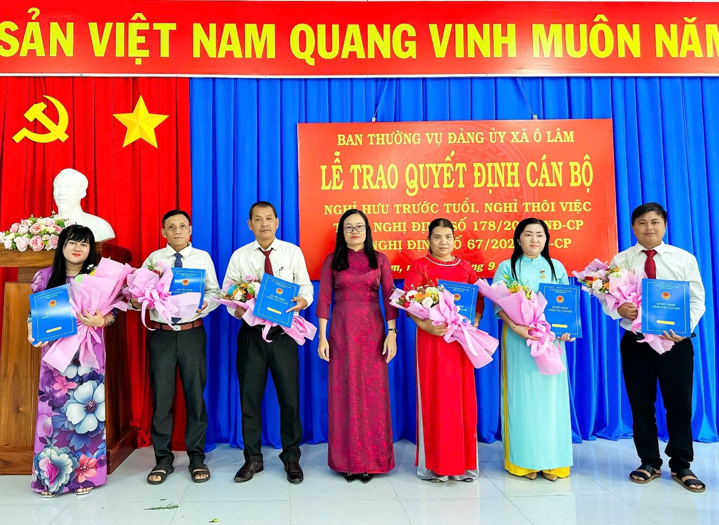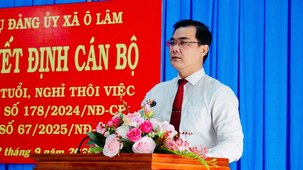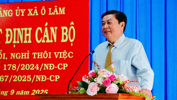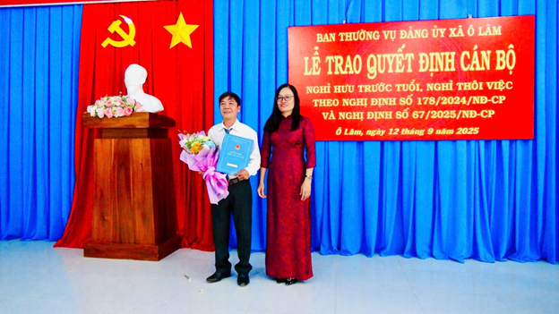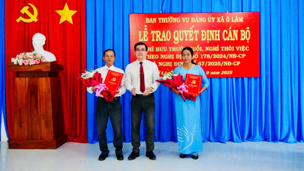 Sáng ngày 12/9/2025, Đảng ủy, UBND xã Ô Lâm, tỉnh An Giang tổ chức Lễ trao quyết định cán bộ nghỉ hưu trước tuổi, nghỉ thôi việc theo Nghị định số 178/2024/NĐ-CP của Chính phủ và Nghị định 67/2025/NĐ-CP của Chính phủ cho 16 cán bộ, đảng viên, công chức xã. Tham dự buổi lễ có Phó bí thư Thường trực Đảng ủy xã Tiêu Đình Hiếu Nhân Trung, Ủy viên ban thường vụ, Phó chủ tịch UBND xã Neáng Sâm Bô.